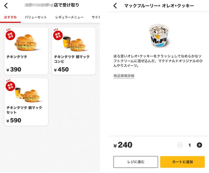 左:好きな商品を選んでカートへ。右:今回は「マックフルーリー」をチョイス。「単品、しかもスイーツ」という店頭では少々抵抗を感じる注文も、オンライン上ならまったく気になりません(アラフォー男性記者の個人的な感想です)