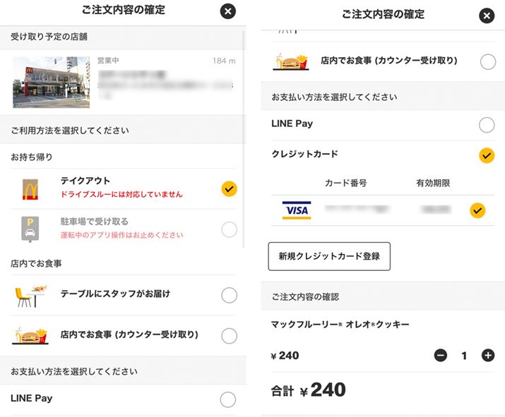左:商品の受け取りは「テイクアウト」か、対応店であれば「ドライブスルー」も選べます。店内で食事する場合は「テーブルでの受け取り」も選択可能。右:今回は手持ちのVisaカードでの決済を選択。後日、カード側のポイント還元が確認できました