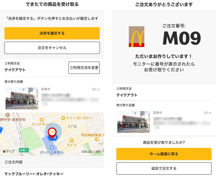 左:「決済を確定する」ボタンを押すと注文完了。右:商品の受け取りに必要な「ご注文番号」が表示されます