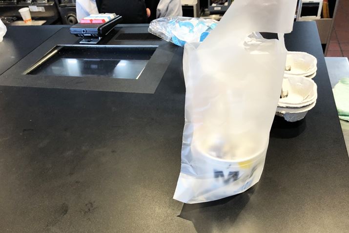 店舗に入ると、すでにカウンター上の画面に筆者の注文番号が表示されていました。冒頭に書いたようにレジ待ちで十数人が並んでいましたが、レジのあるカウンターとは別の、「モバイルオーダー 受け取りはこちら」と掲示されたカウンター上に筆者が頼んだ「マックフルーリー」がすでに用意されていました。念のため店舗スタッフに注文番号を確認し、無事、受け取り完了です。
