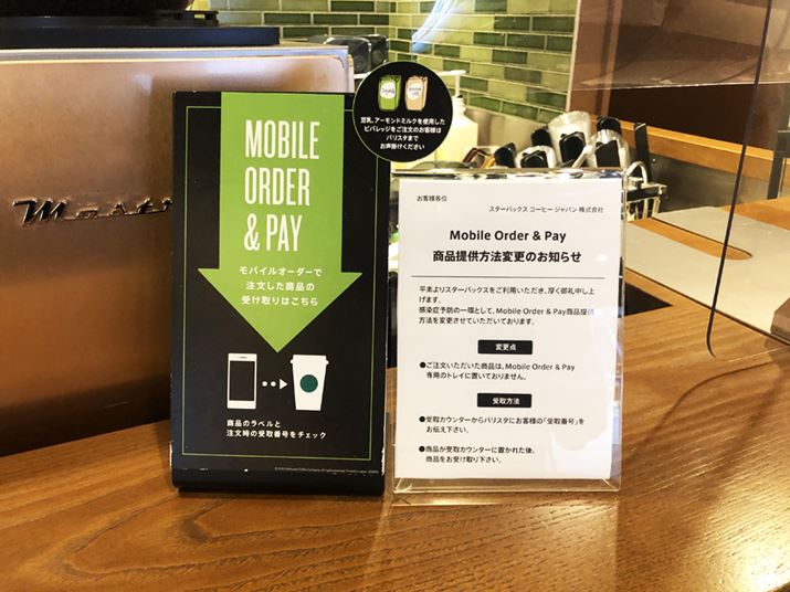 商品を受け取る際は、受け取りカウンターのスタッフに注文番号(ないしは注文時に設定したニックネーム)を伝えて商品を受け取ります。昨年2019年8月に筆者がスタバのモバイルオーダーを使った際は、モバイルオーダー受け取りカウンターの専用トレイに注文商品が自動的に置かれ、商品に書かれた注文番号を見て客が持って行く仕組みでしたが、変更されたようです。
