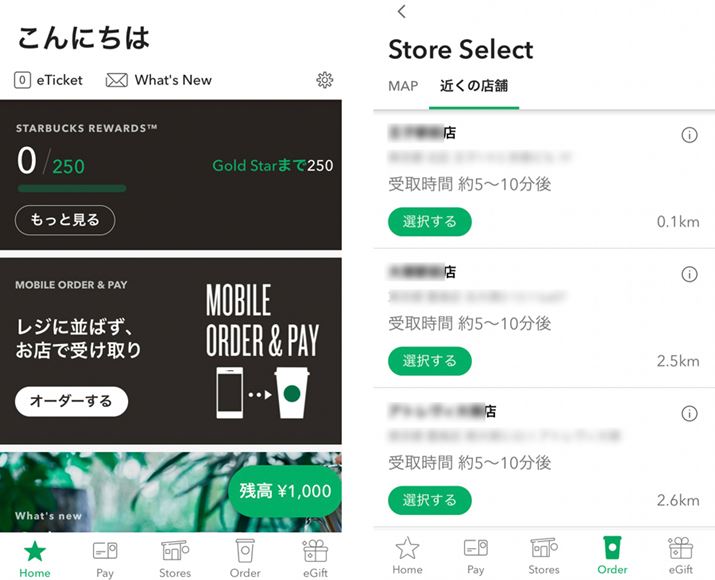 左:スタバ公式アプリのトップ画面。「Mobile Order & Pay」をタップするとオーダーができます。右:利用したい店舗を選択