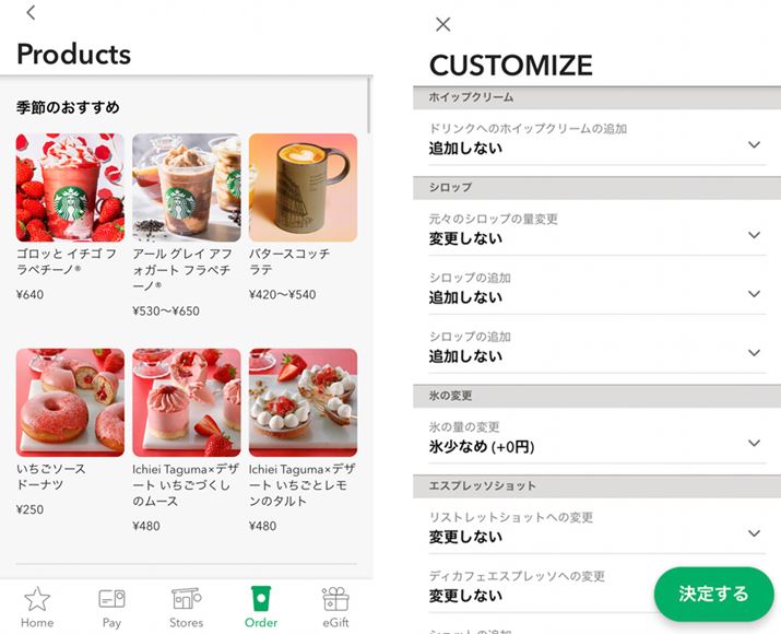 左:普段はなかなか凝ったドリンクを頼めない筆者のような人でも、モバイルオーダーなら腰を落ち着けて選べるかもしれません。右:細かいカスタマイズも選べます