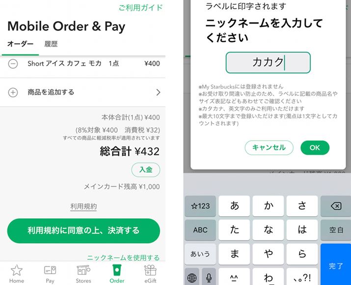 左:画面は決済前のもの。右下のリンクから「ニックネーム」を設定できます。右:ニックネームは恒久的なものではなく今回の注文時のみ有効。友人同士などでコミュニケーションツールとして楽しんだりもできそうです
