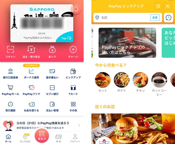 左:PayPayのトップ画面にある「ピックアップ」からサービスに入ります。右:「PayPayピックアップ」のトップ画面。スマホの位置情報から近隣店舗が表示されます