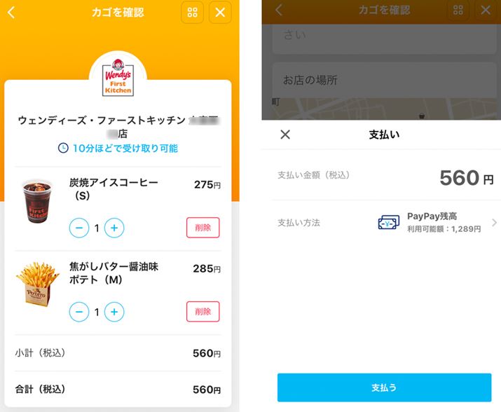 左:注文商品をカートに入れると、受け取りまでの目安時間が表示されます。右:決済はPayPay残高のみに対応