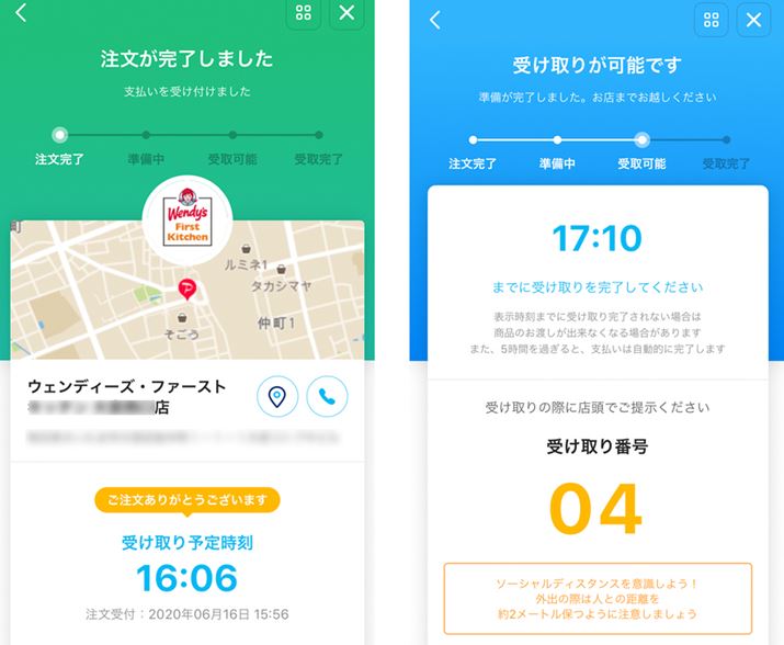 注文が終わると、商品が準備される目安の時間が表示され、商品の準備状況に応じて画面上のステータスが変化していきます。このときは注文から5分ほどで準備が完了。店頭で受け取り番号を伝えてスムーズに商品を受け取ることができました。