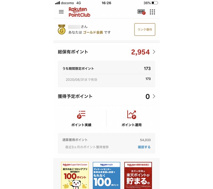 楽天ポイントクラブアプリのトップ画面。画面右下の「ポイント運用」からサービスに入れます