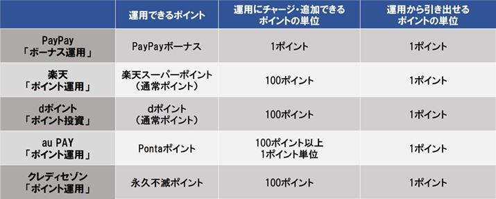 ポイント運用各サービスの「元手」となるポイントと、運用にまわせる&引き出す際の「ポイントの単位数」