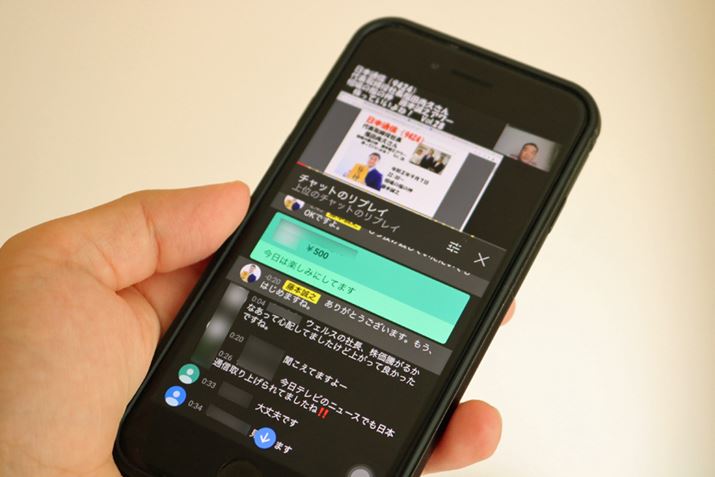 画像は、株式アナリスト藤本誠之氏が運営する公式チャンネルのライブ配信画面。配信画面の下がスーパーチャット欄。投げ銭金額が多いコメントが目立つ仕組みで配信者に気づいてもらいやすくなっています