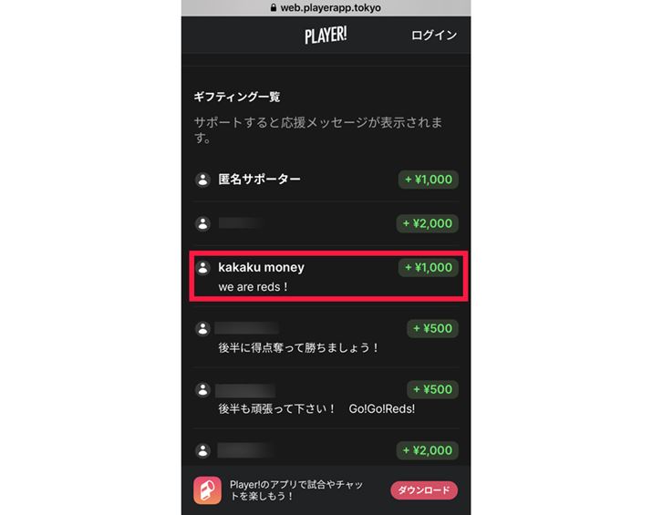 そんな中、浦和レッズは、投げ銭プラットフォームのひとつ「Player!」を使ってファンが課金できる仕組みを導入しました。「オンラインギフティングイベント」と題し、実際の試合が行われている時間に合わせて、Player!上で元選手などが試合のトーク解説を配信。ファンはそれを聞きながら投げ銭ができる仕組みです(Player!上では映像配信がないため、試合の映像を見たいファンは別途ネット配信映像などを見る形)。Player!上ではチャット形式でファンの書き込みがリアルタイムで表示されるのですが、投げ銭があると、その金額がメッセージとともにチャット上に表示されます。