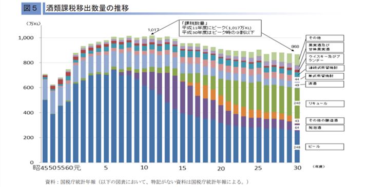まずは酒類業界全体の動向から。筆者も薄々感じていましたが、「お酒離れ」は数字でも明らかなようです。国税庁によると、国内の酒類製造と輸入分をあわせた数量を表す「酒類課税数量(国内出荷数)」は、1999年の1,016万6,000キロリットルをピークに下降。2018年には868万4,000キロリットルまで落ち込んでいます。