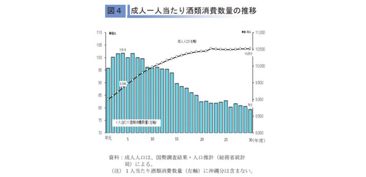 「背景にあるのはやはり『少子高齢化』です。飲酒の習慣のある人は、男女とも30歳代で増加し、70歳以上で減少する傾向にありますが、少子高齢化にともなって、飲酒の習慣がある人自体が減っています。また、成人ひとり当たりの年間の飲酒量も、1989年以降では1992年の101.8リットルをピークに減少を続け、2018年時点では79.3リットルと約20%も減っています」(藤本さん)