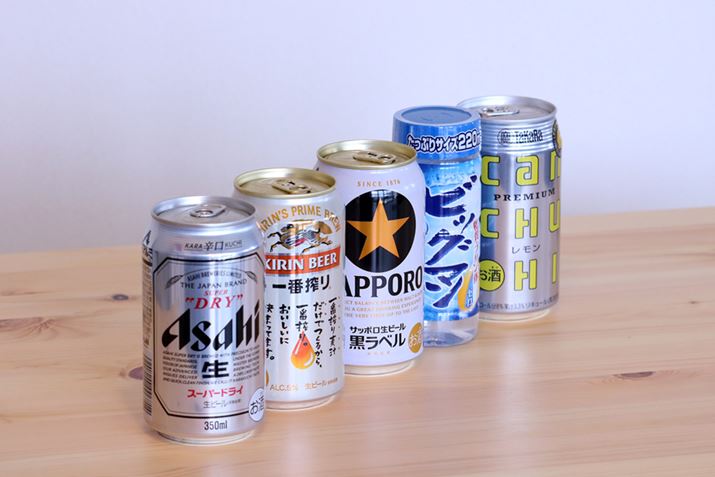 上場している酒類メーカー5社の代表的な商品。写真左から「アサヒスーパードライ」(アサヒグループホールディングス)、「キリン 一番搾り 生ビール」(キリンホールディングス)、「サッポロ生ビール黒ラベル」(サッポロホールディングス)、「ビッグマン 20%」(オエノンホールディングス)、「タカラcanチューハイ レモン」(宝ホールディングス)