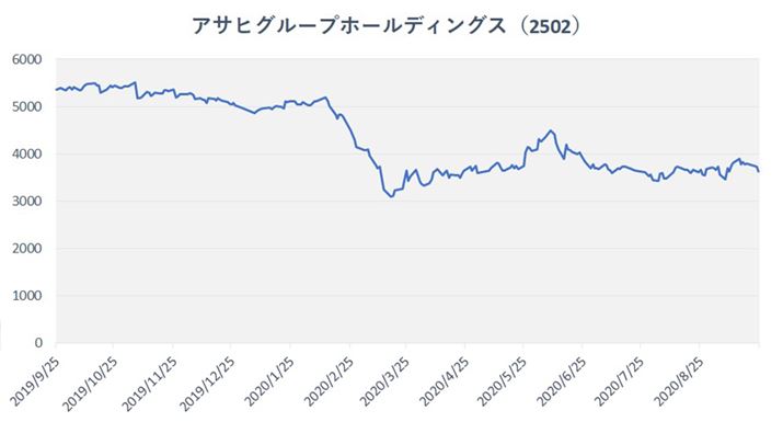 「アサヒは、新型コロナの影響で大きく株価が下がり、2020年3月6日に年初来安値となる3,006円を付けています。緊急事態宣言解除後の6月に4,400円台まで戻したものの、再び売られ、2020年9月24日時点の終値は3,620円と、コロナ前の水準には及びません。この値動きには、前出のとおり、業務用ビールの需要低下が影響していると考えられます。ただし、酒税の改正や外食需要の回復を考えると、今後は期待できると思います。また、アサヒはビールメーカーで唯一の『東京2020ゴールドパートナー』です。来年のオリンピック・パラリンピックの開催が正式に決まれば、それも追い風になるはずです」(藤本さん)