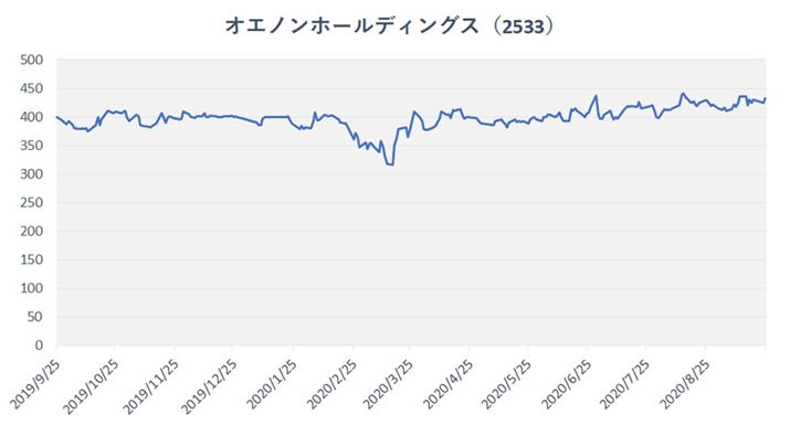 ここからは、焼酎や日本酒などビール以外の商品を取り扱う酒類メーカー2社です。1社目は焼酎などの製造で知られる「合同酒精株式会社」を母体とする持株会社、オエノンホールディングス(東証一部 2533 以下、オエノン)です。2019年12月期の売上高は754億4,400万円です。