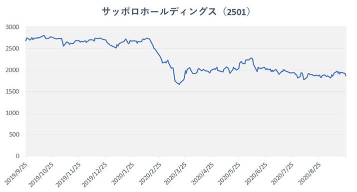 「2020年3月17日に年初来安値の1,602円を付けた後は、2,000円前後の横ばいに。緊急事態宣言解除後の戻りも2,200円台と冴えず、その後は再び横ばい状態です。不動産事業はサッポロの特色でもあり、経営を支える存在ですが、新型コロナによって世の中全体の不動産事業が打撃を受けており、投資家がサッポロに向ける視線にもそれが影響していると考えられます」(藤本さん)