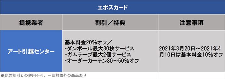 エポスカード会員が割引を受けられるのは「アート引越センター」。通常は基本料金が20%オフに、3月20日〜4月10日は10%オフになります。