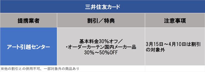 三井住友カード会員が割引を受けられるのは「アート引越センター」。基本料金が30%オフになりますが、3月15日〜4月10日は適用対象外です。