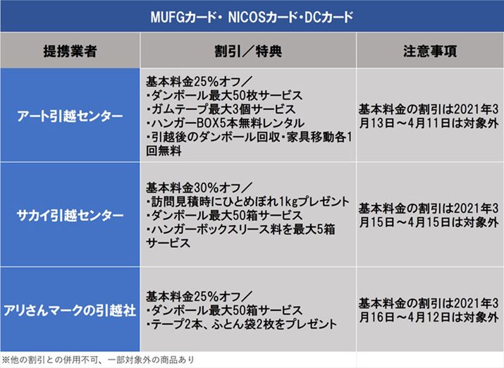 三菱UFJニコスが発行するMUFGカード・ NICOSカード・DCカード会員が割引を受けられるのは下記の3社。ただし、通常期は基本料金が25〜30%オフとなりますが、いずれも3月中旬〜4月中旬の一定期間は割引対象外になるので注意が必要です。
