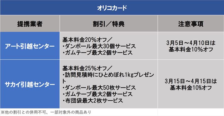 オリコカード会員が割引を受けられるのは「アート引越センター」と「サカイ引越センター」の2社。両社ともに基本料金が20〜25%オフとなりますが、3月と4月の一定期間は10%オフになります。