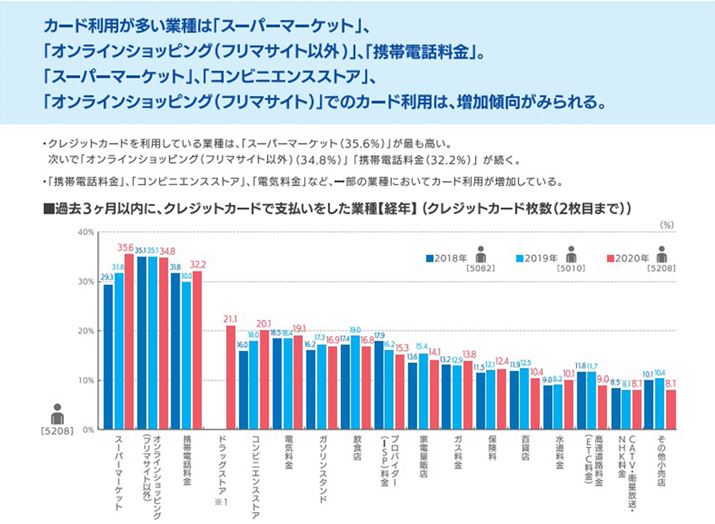 前年から利用率が伸びている業種としては、「スーパーマーケット」(前年比3.8%増)、「コンビニエンスストア」(前年比3.1%増)、「オンラインショッピング(フリマサイト)」(前年比約0.8%増)などがあります。逆に前年から利用率が下がっている業種としては、「飲食店」(前年比約2.2%減)、「家電量販店」(前年比1.3%減)、「百貨店」(前年比1.9%減)があり、新型コロナの影響による購買行動の変化がうかがえます。