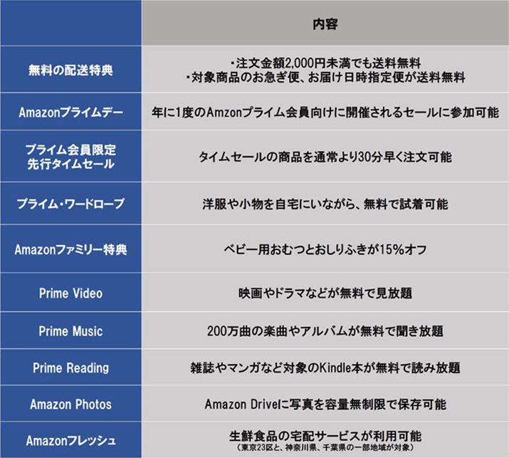 遠藤さんが「Amazonを定期的に利用している方なら、まず検討したいサービス」と強調するのが年会費4,900円、または月500円で利用できる有料の会員サービス「Amazonプライム」です。配送無料や動画配信などはよく知られていますが、使える特典はこれ以外にも数多くあります。主なものを表にまとめました。