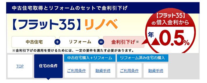 最後に紹介するのが、住宅金融支援機構が提供する「【フラット35】リノベ」です。【フラット35】は、最長35年、長期固定金利型の住宅ローンとしておなじみですが、【フラット35】リノベもその一種です。中古住宅を購入し、一定の要件を満たすリフォーム工事を行なった場合、あるいは一定の要件のもとにリフォームやリノベーションが行われた中古住宅を購入する際に利用でき、【フラット35】の金利が一定期間▲0.5%優遇されるメリットがあります(※)。「一定の要件」とは、中古住宅の性能向上をもたらすリフォーム工事を指します。