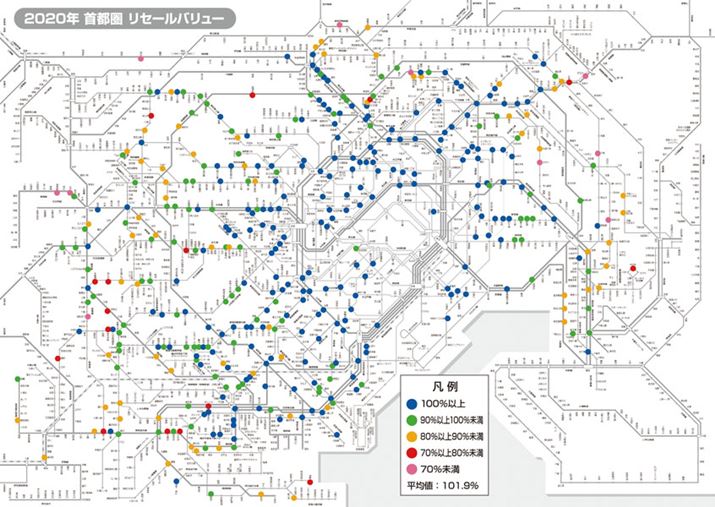 たとえば、10年前の分譲時の1坪(=約3.3u)単価が200万円で、現在の中古マンションとしての取引価格が同150万円であれば、リセールバリューは「150万円÷200万円×100=75%」。いっぽう、分譲時価格が同じ200万円でも、現在の取引価格が250万円であれば「250万円÷200万円×100=125%」。この数値が大きい駅(エリア)ほど、新築時の価値を高く維持できている(上昇している)ことを意味します。