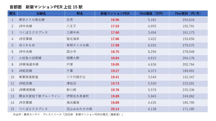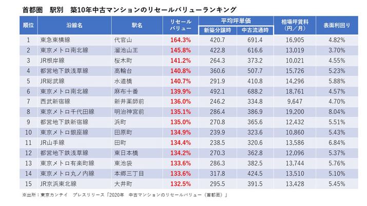 首都圏でリセールバリューで上位に入ってくるのはどのような駅なのか。2020年のトップ15は以下のとおりです。