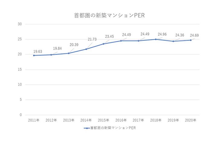 首都圏のマンションPERの平均は、下記のグラフを見てわかるとおり上昇傾向となっています。2011年のPERは19.63だったのが、アベノミクスが始まった2012年から上がり始め、2020年は11年比5ポイント増の24.69。2011年だったら購入に充てた資金を20年弱で回収できたのが、現在は25年弱かかるようになったことを意味します。「賃料相場はさほど大きく変動しない反面、新築マンションの価格は景気動向などを受けて値上がりしやすい傾向があります。PERの上昇は首都圏の新築マンション価格の高騰を受けてのことで、『割高感』は一層強まっています」(住宅ジャーナリスト・山下さん)