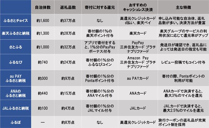 それでは、ふるさと納税ポータルサイトの中でも、注目の8つのポータルサイトをピックアップ。それぞれの特徴と、支払いに使うとお得なクレジットカード・キャッシュレス決済をまとめました。