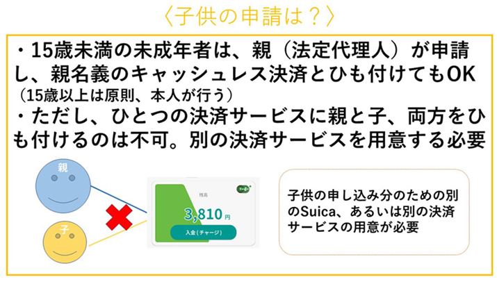 第1弾と同様ですが、15歳未満の未成年者の申し込みについては、本人に代わり、親などの法定代理人が手続きを行うことができます。未成年者の場合、親名義のキャッシュレス決済サービスをひも付けることも可能です。つまり、両親と子ども2人の4人家族の場合、1世帯で最大80,000円相当の還元を受けられることになります。
