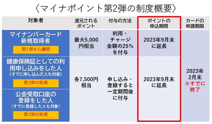 最大20,000円相当のポイント還元を受けられる、マイナポイント第2弾。マイナポイントの申請期限は2023年9月末まで延長されました