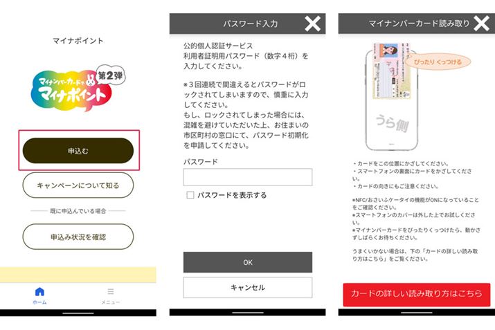 最初にマイナポイントアプリをダウンロードし、トップ画面の「申込む」をタップ。続いて、マイナンバーカードを受け取った際に設定した「利用者証明用電子証明書」の4ケタのパスワードを入力し、マイナンバーカードの読み取り作業を行います。