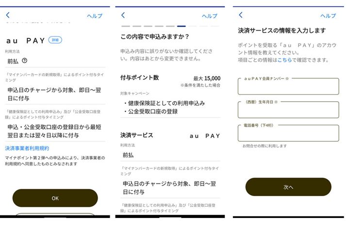 キャッシュレス決済サービスを選択すると、ポイント付与のタイミングが表示されます。こちらはサービスごとに異なるので、確認しておきましょう。決済サービスのIDとセキュリティコード(au PAYの場合、生年月日でした)の入力が求められますが、サービスごとに記載されている場所が異なるので、下記サイトなどで事前に調べておくとスムーズでしょう。
