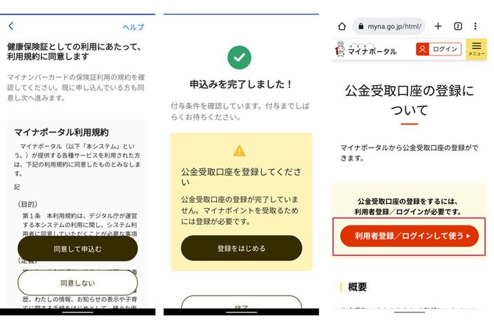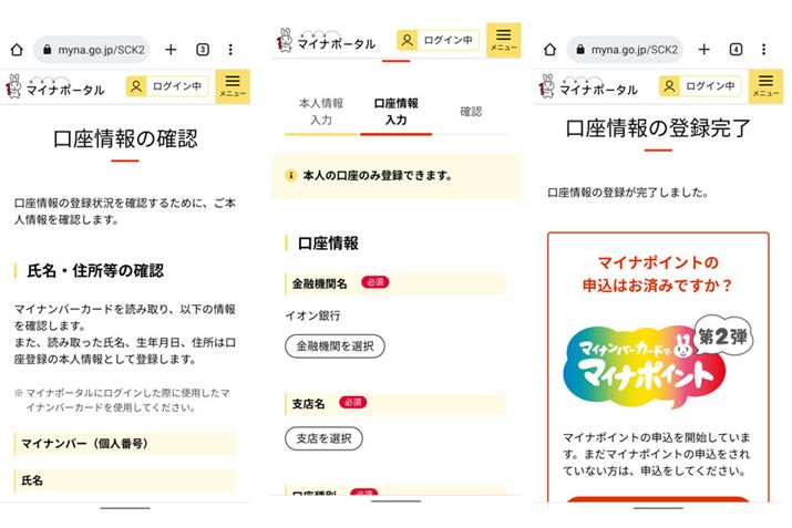 続いて、マイナポータルに移動し、自身の住所や登録する銀行口座の情報を入力し、公金受取口座の登録作業を進めていきます。この作業が終われば、マイナポイント第2弾の申請手続きは完了です。