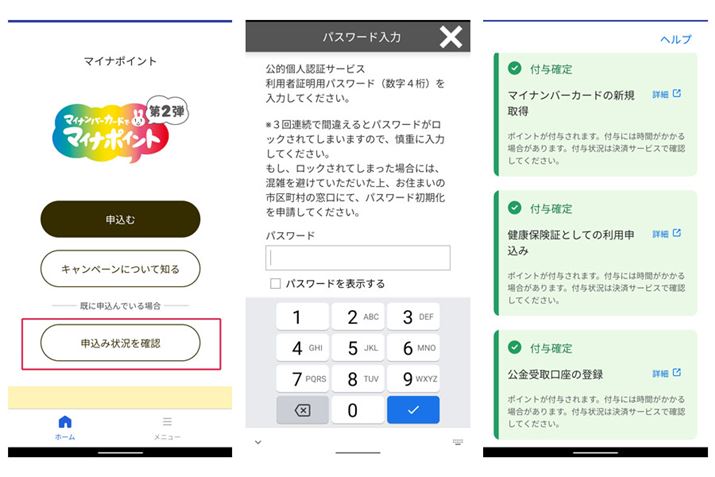 受け取る際には、「利用者証明用電子証明書」の数字4ケタのパスワードを設定しますが、これをメモするなどして記録する作業は必ずやっておいたほうがよいでしょう(英数字6文字〜16文字で設定する「署名用電子証明書」のパスワードも、e-TAXなどで使うことがあるのでメモしておきましょう)。なぜなら、取得後に行うポイント申請の際にこのパスワードが必要となり、3回間違えて入力するとロックがかけられてしまうのですが、その解除には役所の窓口に行く必要があり、余計な時間がかかってしまうからです。