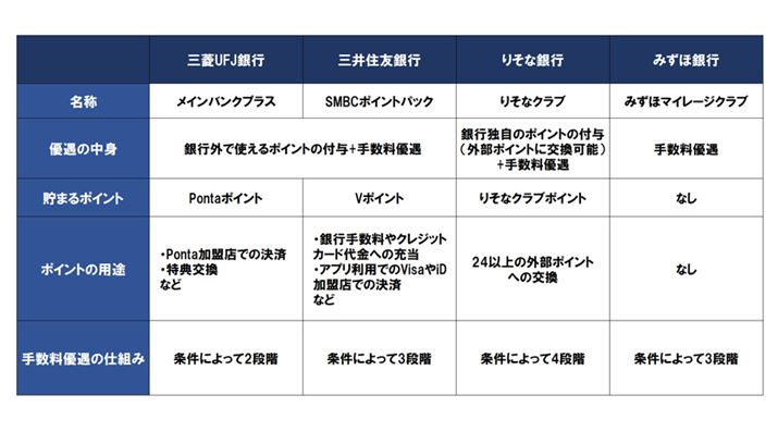 以下は、今回比較した4つの都市銀行の優遇サービスの概要をまとめたものです。