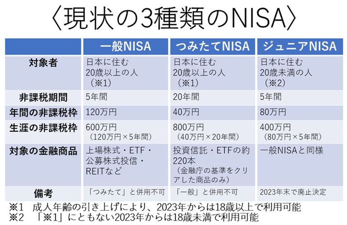 現状のNISAは「一般NISA(2014年開始)」「つみたてNISA(2018年開始)」「ジュニアNISA(2016年開始)」の3種類。このうち、未成年を対象にした「ジュニアNISA」はすでに、2023年末で廃止となることが決まっていました。「一般NISA」は、非課税で投資できる年間の枠は120万円で、上場株式を含めた幅広い金融商品を対象にしているのが特徴。ただし、非課税期間は5年間です。