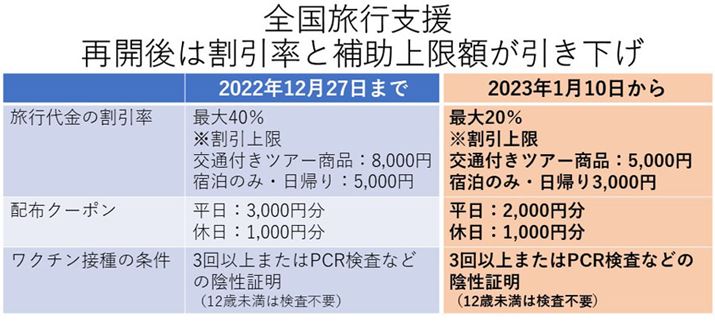 「全国旅行支援」の概要を、休止前と再開後で比較したのが下表になります。まずは、再開後の基本的なルールを見ていきましょう。