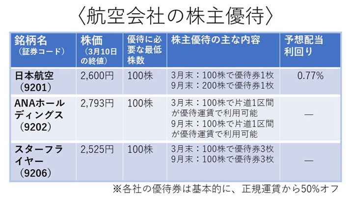 航空会社では、JALとANAの大手2社で優待内容に大きな違いはありませんが、JALの9月優待を受けるには200株必要な点は注意したいポイントです(筆者もこれを失念して、優待を受け損なった経験があります)。スターフライヤーは「羽田―北九州」線をよく使う方にはおすすめの優待。ただ、いずれの優待券も各社の早期割引き運賃と比較したうえで、利用したほうがよいでしょう。