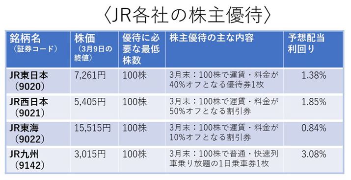 このほか、JR九州の駅ビルなどで使える割引券2,500円分と、福岡と韓国・釜山を結ぶJR九州高速船の往復運賃が10,000円となる割引券も贈呈され、充実した優待内容となっています。JR九州の株価は3月10日時点で3,015円なので、100株なら301,500円で優待を受けられます。予想配当利回りは3.08%になります。