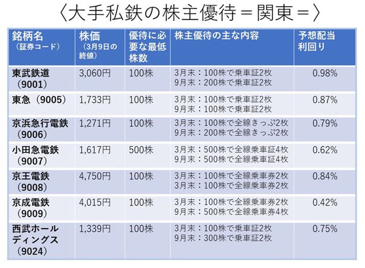 次にご紹介するのは、関東の大手私鉄の株主優待。基本的な優待内容は各社で共通しており、自社路線の片道1回の乗車が無料になる優待券に加え、自社系列のホテルや百貨店、レジャー施設などの割引券がセットになったものです。そのため、お住まいのエリアなど生活圏にある私鉄の優待内容をチェックしてみるとよいと思います。