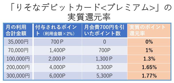 月35,000円の利用で月会費の元が取れ、月70,000円の利用で実質のポイント還元率は1%。月100,000円を超えてくると還元率は1.3%を超え、クレカでも目にしない数字になってきます。このカードには、ショッピング保険(年間上限額100万円)と不正利用補償(年間上限額150万円)も付帯しているので、こうした付帯保険や毎月の利用金額を基に、自身にとって利用価値があるか否かを判断するとよいでしょう。なお、同行からは年会費無料でポイント還元率0.5%の「りそなデビットカード」も発行されています。