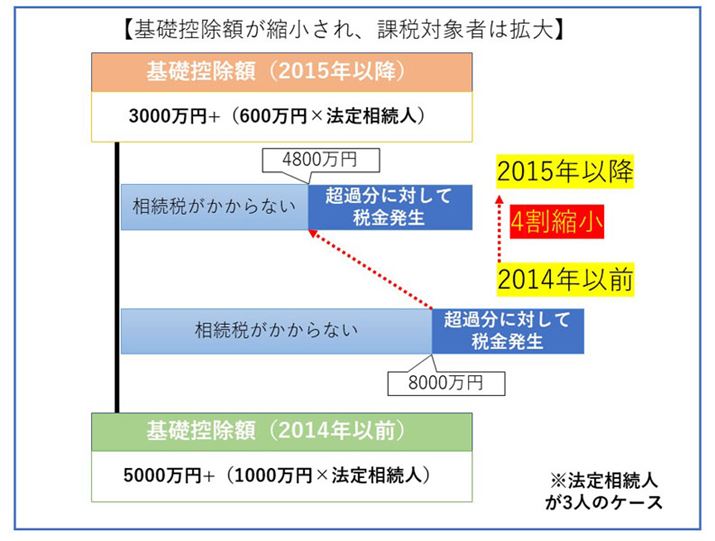たとえば、法定相続人が妻と子ども2人の計3人の場合、基礎控除額は2014年以前は「8000万円」だったのに対し、2015年以降は4800万円となり、相続税の課税対象者は拡大されました。