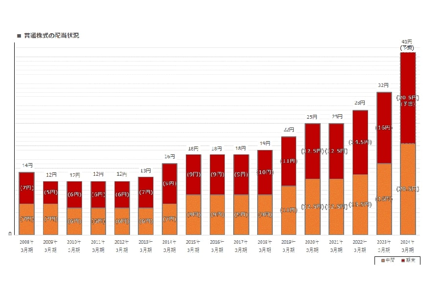そんな「増配銘柄」の一例をあげます。皆さんにもおそらくおなじみの日本最大の金融グループ、三菱UFJフィナンシャル・グループ(8306)がそのひとつです。同社の配当金は10年前の2013年3月期には13円でした。それが増配により2023年3月期には32円となっています。また、2024年3月期には41円が予定されています。