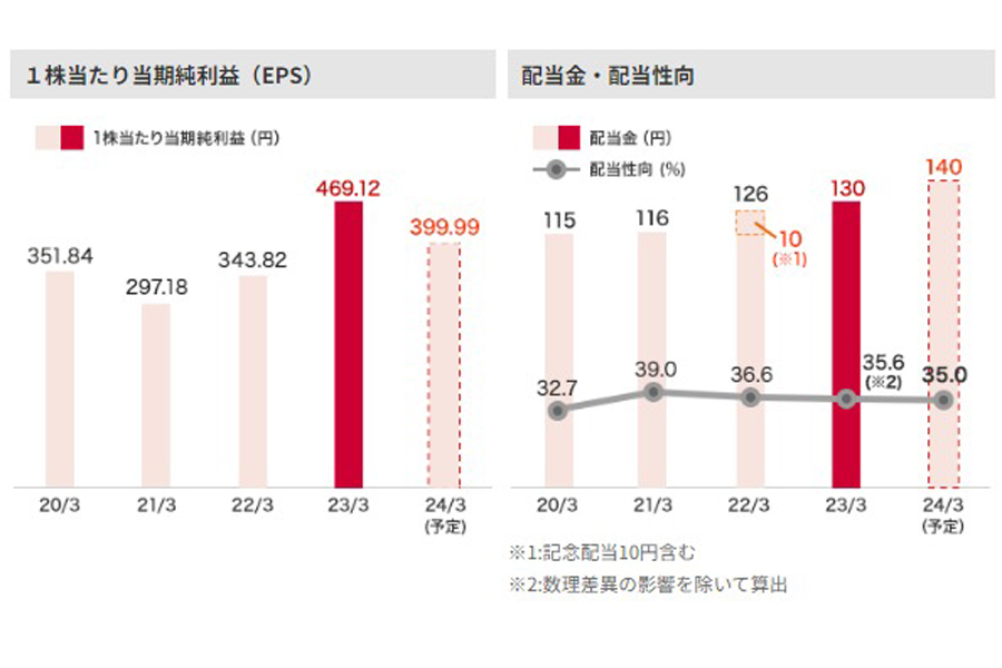 大和ハウス工業の配当金・配当性向(右グラフ)。画像は公式サイトより(2023年12月8日時点)