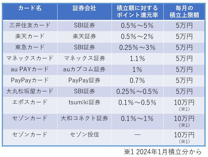 こうした流れもあり、マルイグループのtsumiki証券(エポスカード)やセゾン投信(セゾンカード)、大和ネクスト証券(セゾンカード)は毎月の上限額を2024年から10万円とすることを発表しています。