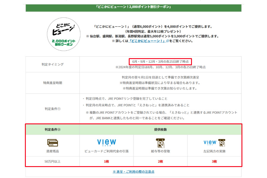 贈呈枚数は毎年6月25日、12月25日の年2回、そのときの口座残高などの状況で特典内容が判定されます。割引券はデジタルクーポンとして贈られ、「えきねっと」から利用することになります。
